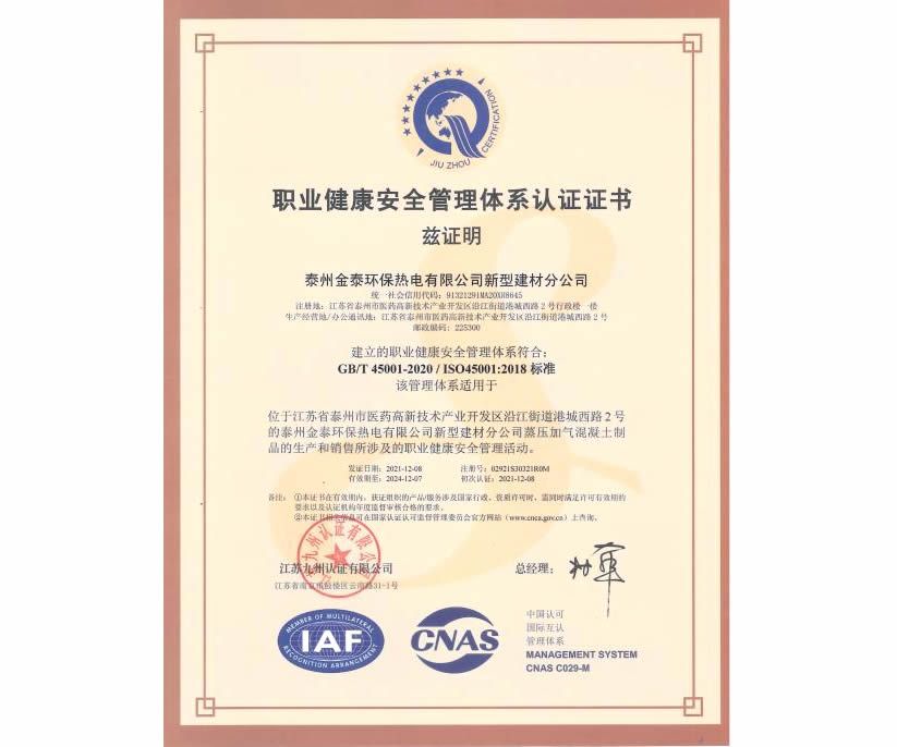职业健康安全管理体系认证证书